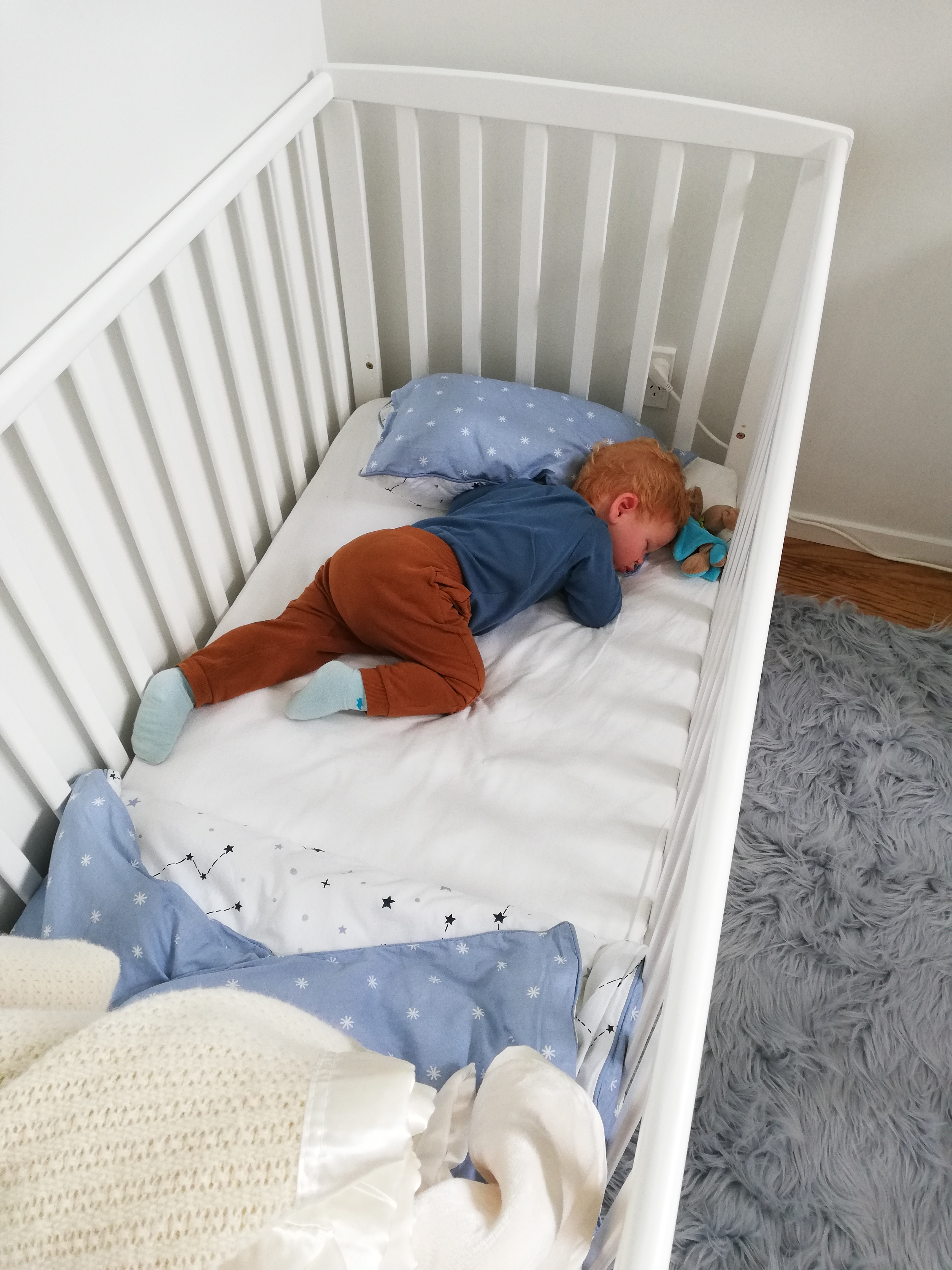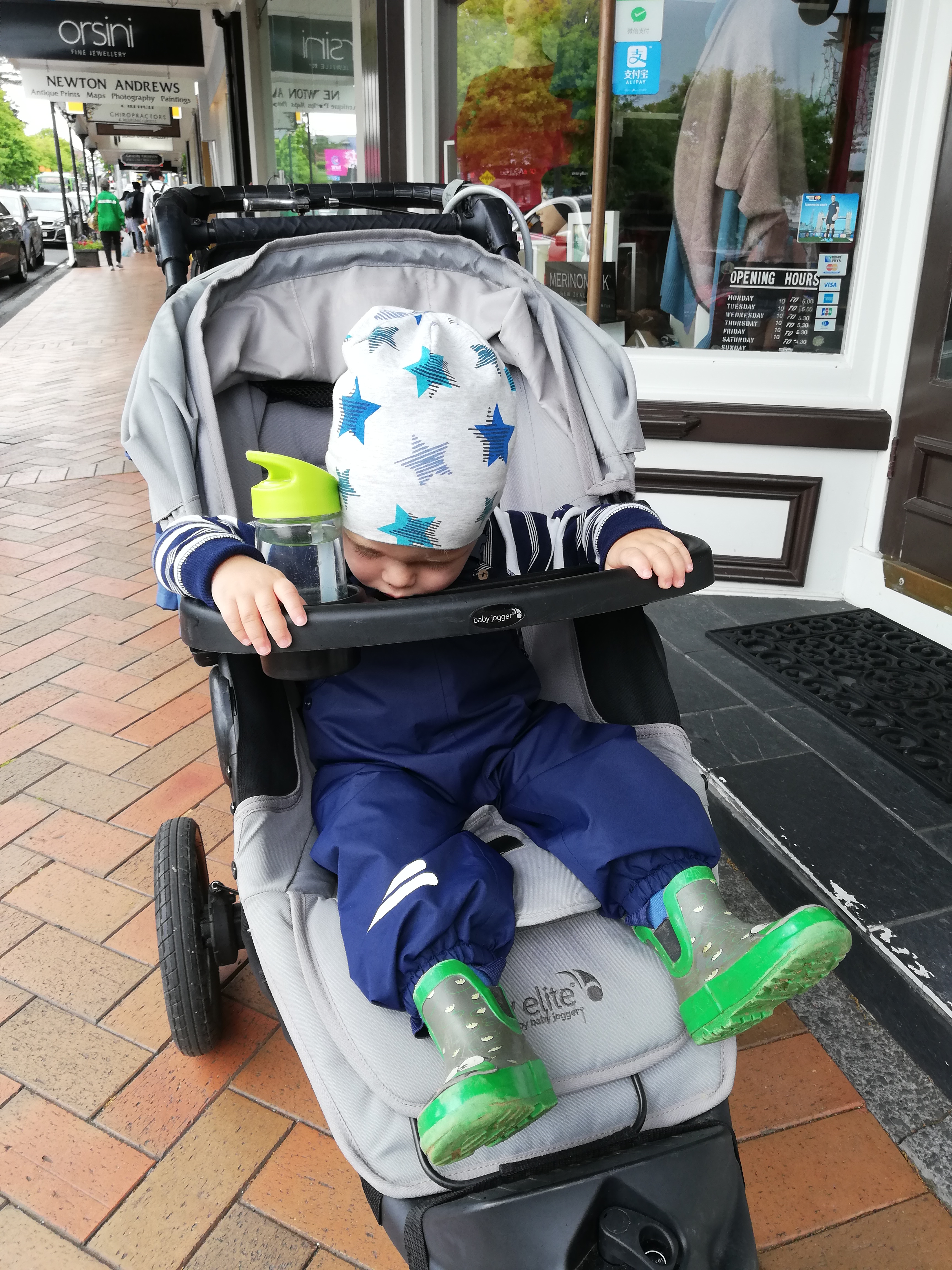 Noah war natürlich um halb 6/6 schon wieder der Meinung aufstehen zu müssen und dieses Spiel haben wir fast eine Woche gespielt. 4 Uhr aufstehen, 4:30 Uhr aufstehen, 5 Uhr aufstehen, usw. Dafür war er am späten Vormittag im Koma und hat fast 4 Stunden geschlafen. Einmal hat er beim Spazieren sogar im Sitzen eingeschlafen (sh. Foto). Aufgefallen ist es Christian nur, weil ihn die entgegenkommenden Leute angelacht haben und er sich gedacht hat: WTF, das kann nicht sein!