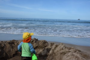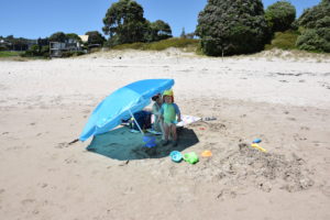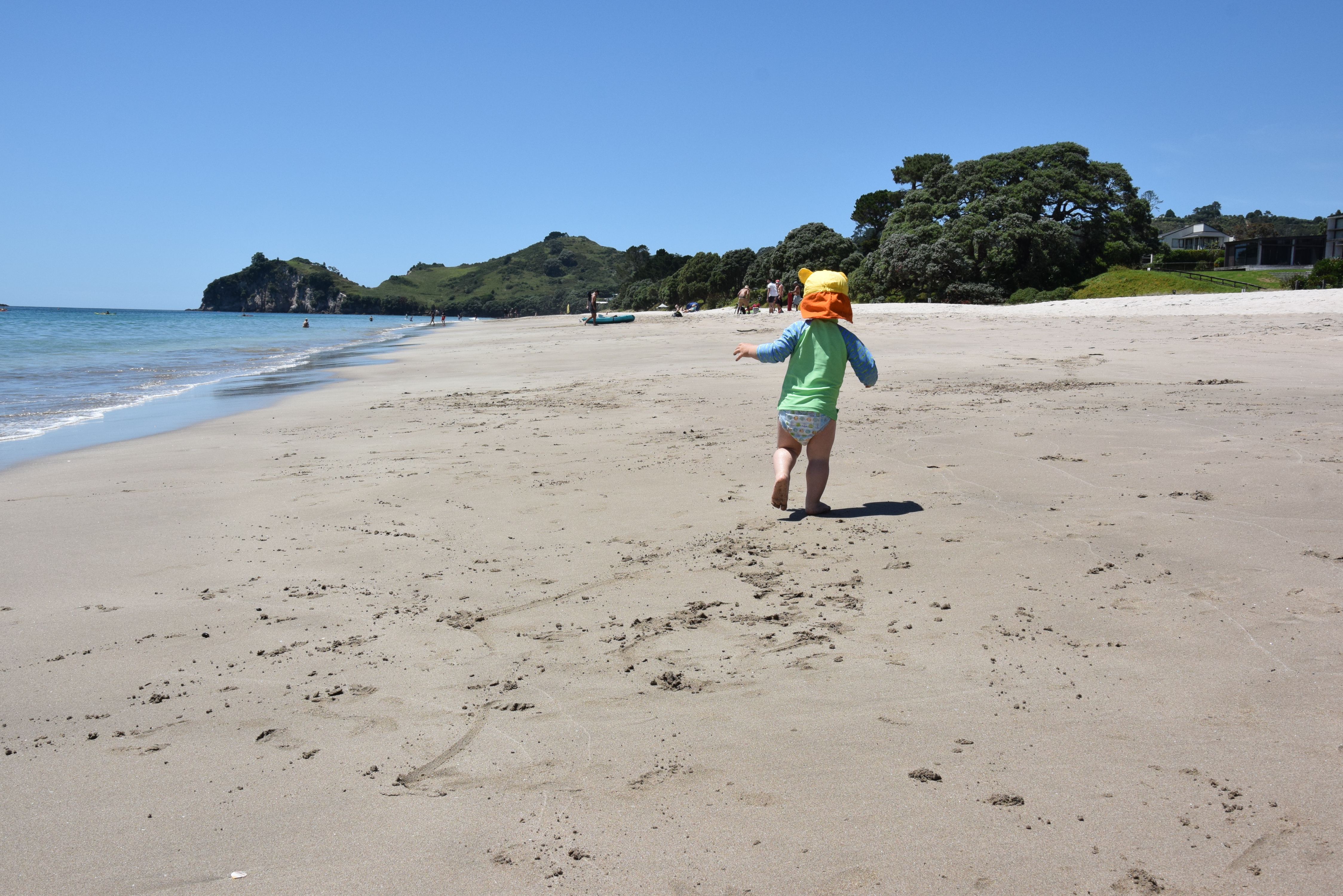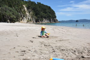 Der Strand ist traumhaft: Weißer Sand und kristallklares Wasser. Da sich unser Apartment am Ende des Strandes befindet, ist relativ wenig los und Noah kann stundenlang im Sand buddeln und vor den Wellen davonlaufen. Uns war das Wasser zum Baden noch etwas zu kalt, aber viele Kiwis haben sich nicht davon abhalten lassen.