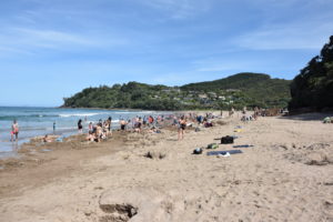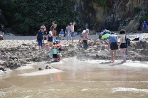 Circa 10 Minuten entfernt befindet sich der „Hot Water Beach“. Das Besondere an diesem Strand ist ein kleiner Abschnitt, unter dem sich eine heiße Quelle befindet. Teilweise ist der Sand bis ca. 60° heiß und man kann gar nicht drüber laufen. Sobald Ebbe ist, kann man sich hier seinen eigenen Thermalpool graben. Die Touristen kommen mit Schaufeln und Spaten bewaffnet und graben wie wild im Sand. Ist ziemlich lustig ihnen dabei zuzusehen.