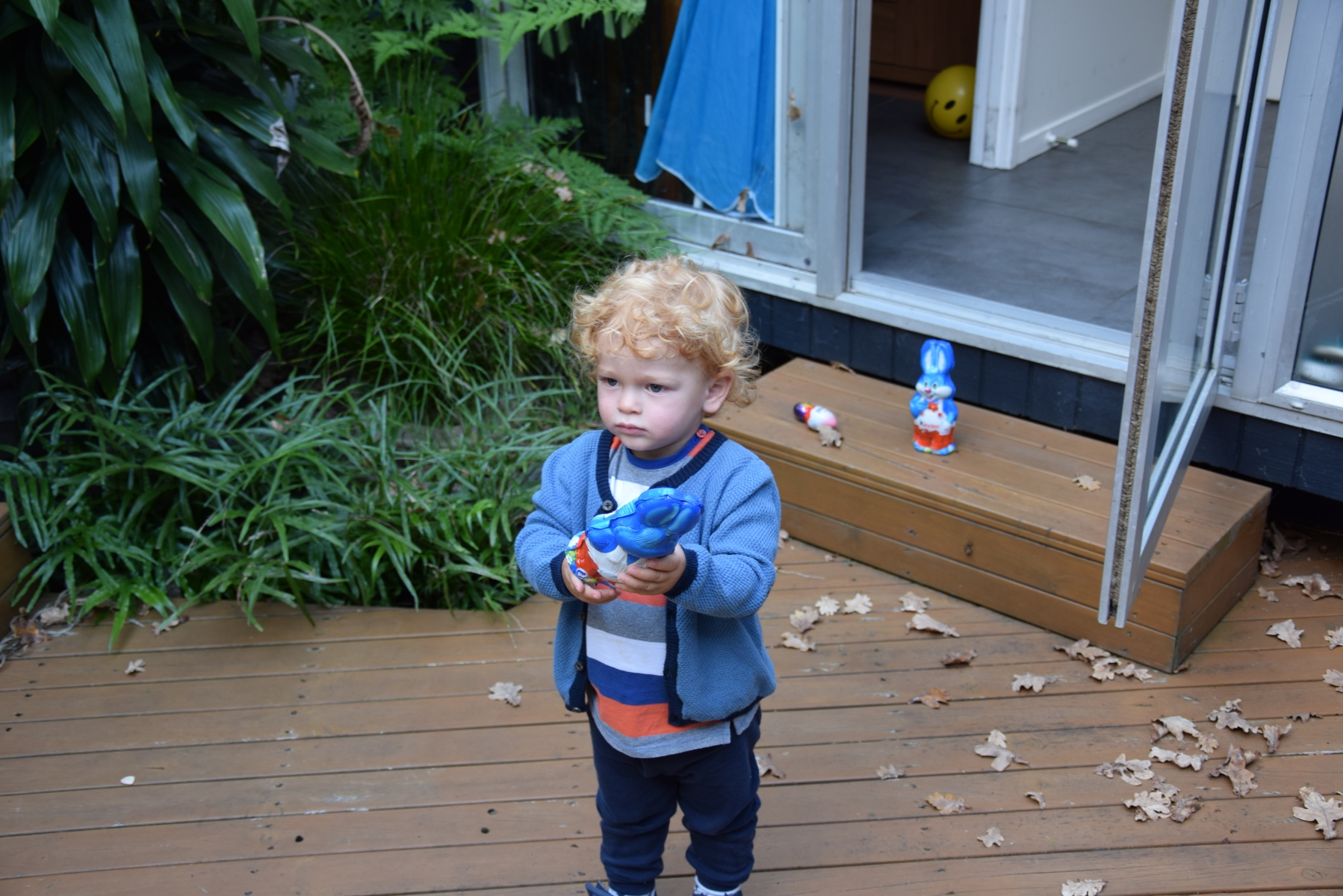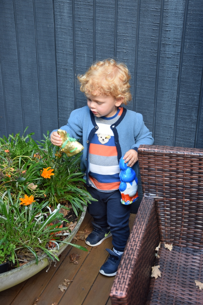 Genau wie in Österreich, suchen die Kinder hier zu Ostern Ostereier. Noah hat sichtlich Spaß!