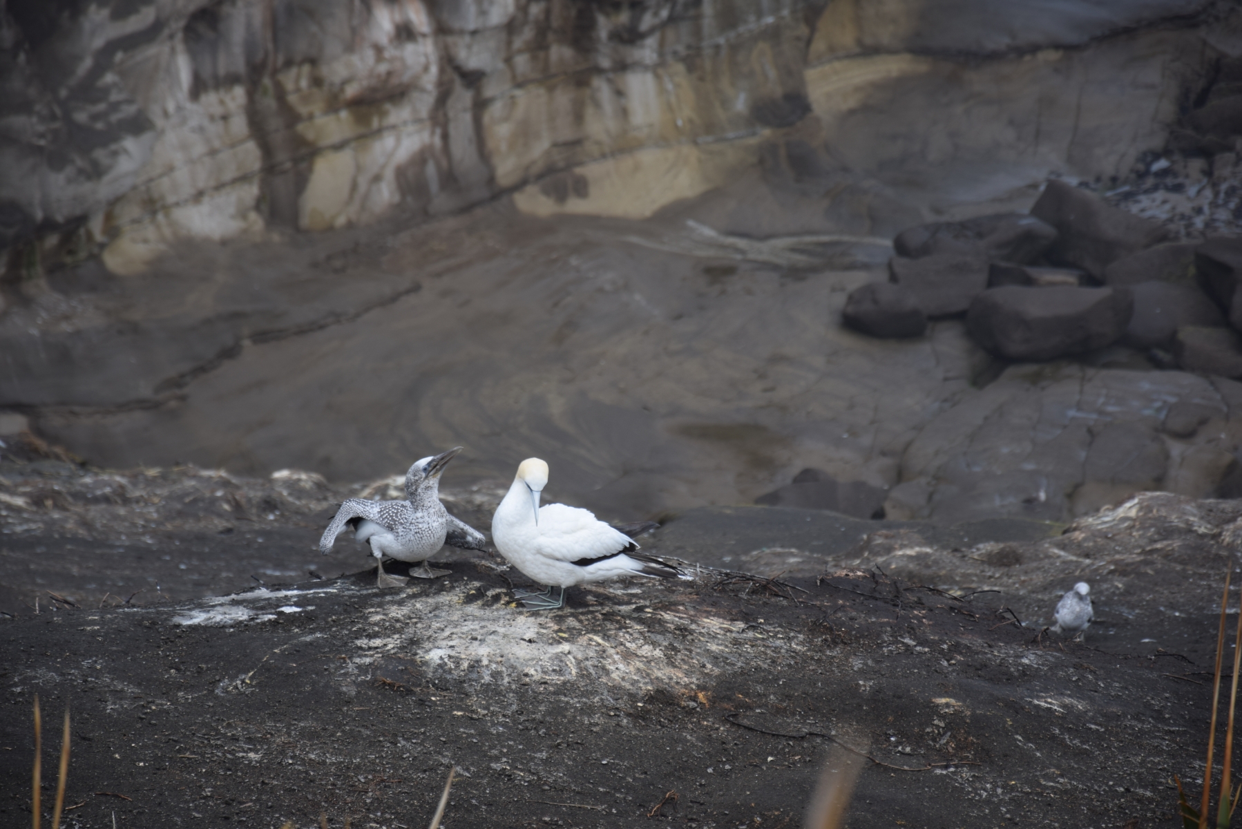 Wir kommen bei strömendem Regen an, aber glücklicherweise lässt die Sonne nicht lange auf sich warten. Neben dem Strand ist die Tölpelkolonie, die hier von August bis April ihre Brutzeit verbringt, ein Besuchermagnet. Ende April sind allerdings nur noch eine Hand voll übrig – aber immerhin.